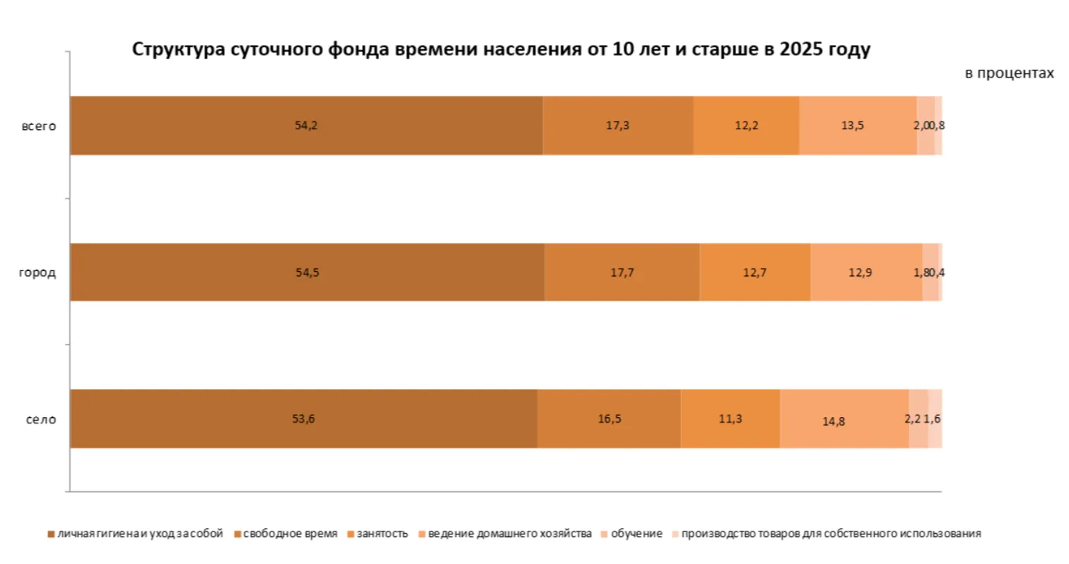 - 54,2% (13 часов) среднесуточного времени казахстанцев (в возрасте от 10 лет и старше) приходится на личный
