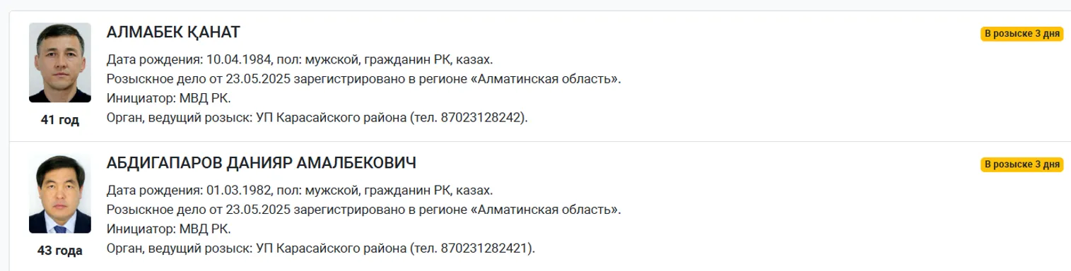 Как указывается в объявлении, разыскиваются 41-летний Канат Алмабек и 43-летний Данияр Абдигапаров.