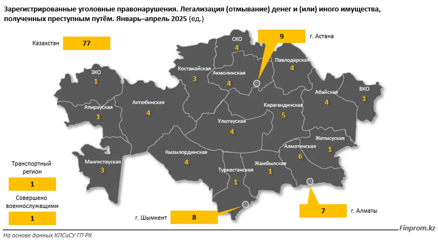 А что говорит казахстанская статистика? За январь–апрель текущего года в РК зарегистрировали 77 уголовных правонарушений по статье о легализации (отмывании) денег и (или) иного имущества, полученного преступным путем, против 28 случаев за аналогичный период 2024 года. Таким образом, количество уголовных правонарушений в секторе выросло в заметные 2,8 раза.