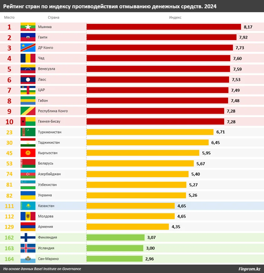 В рейтинге худших стран по индексу противодействия отмыванию денежных средств за 2024 год Казахстан занял 111-е место из 164, сообщает Finprom.kz.