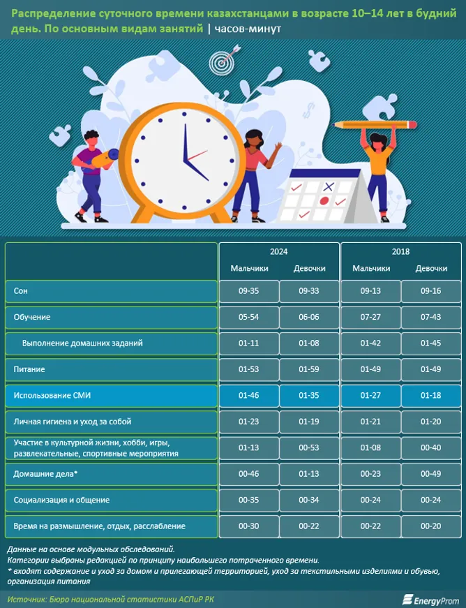 Казахстанские школьники стали проводить больше времени в интернете и меньше — за уроками. Такой вывод сделали аналитики Energyprom.kz на основе результатов модульных обследований, проведенных специалистами Бюро национальной статистики (БНС) АСПиР РК.