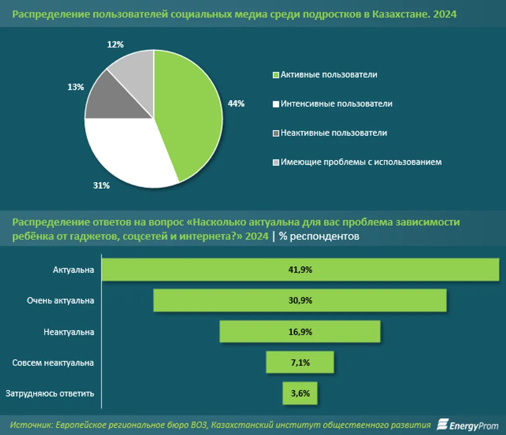 Чтобы ответить на вопрос, актуальна ли для современных подростков проблема зависимости от цифрового контента, приведем данные социальных исследований Казахстанского института общественного развития (КИОР). В прошлом году эта тема затрагивалась в докладах института. В отчете «Безопасность детей в цифровом пространстве» специалисты КИОР приводили информацию Европейского регионального бюро ВОЗ. Согласно источнику, почти половина (44%) подростков в Казахстане являются активными пользователями интернета, то есть ежедневно общаются онлайн. Еще 31% контактируют с другими людьми через мессенджеры и соцсети «почти все время в течение дня». 13% опрошенных в ходе исследований респондентов отметили, что переписываются нечасто — раз в неделю или реже. Наименьшая категория опрошенных (12%) по разным причинам вовсе не пользуется социальными медиа.
