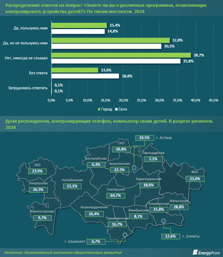 Любопытно, что в разных регионах отношение родителей к вопросу контроля детских телефонов различное. Например, в Улытауской области 64,7% респондентов отметили, что пользуются приложениями для родительского контроля, а в Шымкенте доля таких опрошенных минимальна — всего 6,7%. Больше 87% шымкентцев, прошедших опрос, либо вообще не слышали про такие специальные программы, либо знают о них, но не пользуются. Похожая ситуация наблюдается в большинстве южных регионов — Туркестанской, Алматинской, Кызылординской областях.