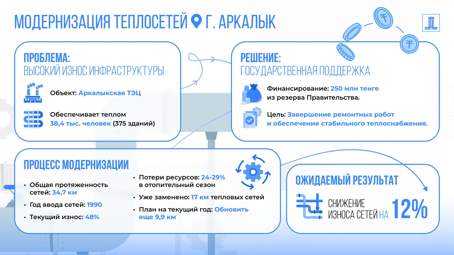 Проводимая модернизация имеет важное значение для обеспечения надёжного прохождения отопительного сезона и устойчивой работы систем жизнеобеспечения Аркалыка, население которого составляет 38,4 тыс. человек.