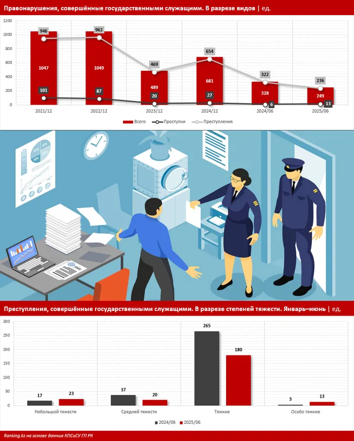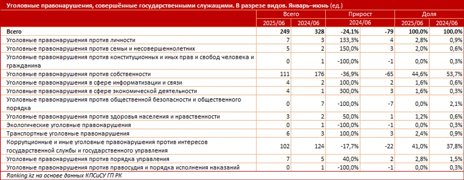 За первое полугодие 2025 года, по данным КПСиСУ ГП РК, казахстанскими государственными служащими было совершено 249 правонарушений — на 24,1% меньше, чем за аналогичный период прошлого года. Среди них насчитывалось 236 преступлений и 13 проступков. Для сравнения: годом ранее было зарегистрировано 322 преступления и 6 проступков, сообщает ranking.kz.