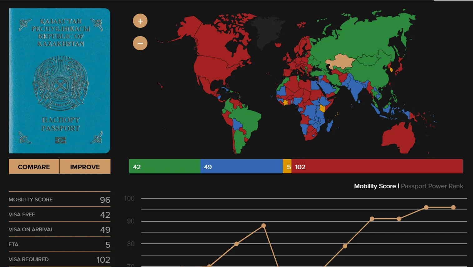 Тем временем в мировом рейтинге силы паспорта Passport Index Казахстан сейчас занимает 56-ю строчку, которую делит вместе с Республикой Вануату (тихоокеанское государство – Ред.). Согласно этой информации, казахстанцы могут посетить без визы 42 страны, еще в 49 получить визу по прибытии, но в 102 государствах им потребуется виза.