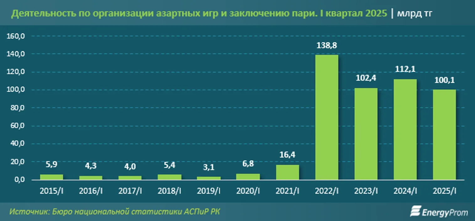 Масштабы игровой зависимости также хорошо видны по объёму услуг, оказанных в сфере организации азартных игр и заключения пари, которые по итогам первого квартала текущего года составили 100,1 млрд тенге — на 10,7% меньше, чем годом ранее. При этом уже четвертый год подряд объём услуг в секторе по итогам первого квартала превышает 100 млрд тенге. Для сравнения: с 2015 по 2021 год он был гораздо скромнее и варьировался от 3,1 млрд до 16,4 млрд тенге.