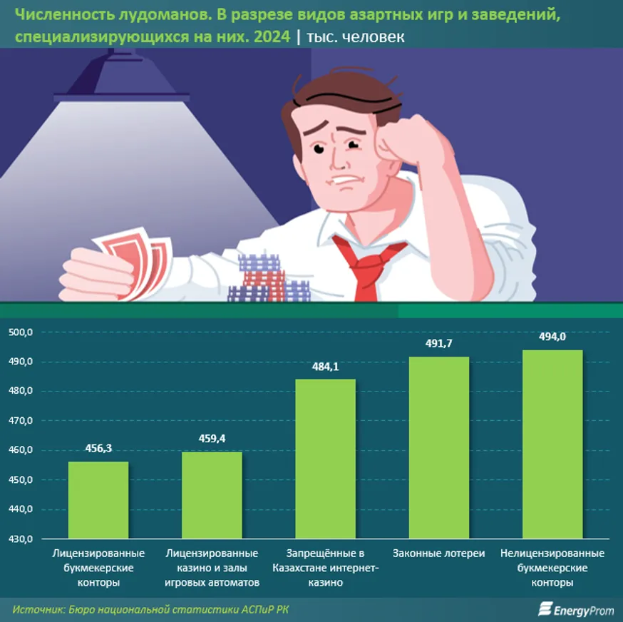 Согласно республиканскому исследованию о причинах и масштабах зависимости от азартных игр, проведенному в конце 2024 года, наибольшая численность регулярно практикующих азартные игры приходится на нелицензированные букмекерские конторы: 494 тыс. человек. Следом идут законные лотереи (491,7 тыс. человек), запрещенные в Казахстане интернет-казино (484,1 тыс. человек), лицензированные казино и залы игровых автоматов (495,4 тыс. человек), лицензированные букмекерские конторы (456,3 тыс. человек). При этом один и тот же человек может регулярно практиковать азартные игры сразу в нескольких видах подобных азартных игр и специализирующихся на них заведений, сообщает Energyprom.kz.