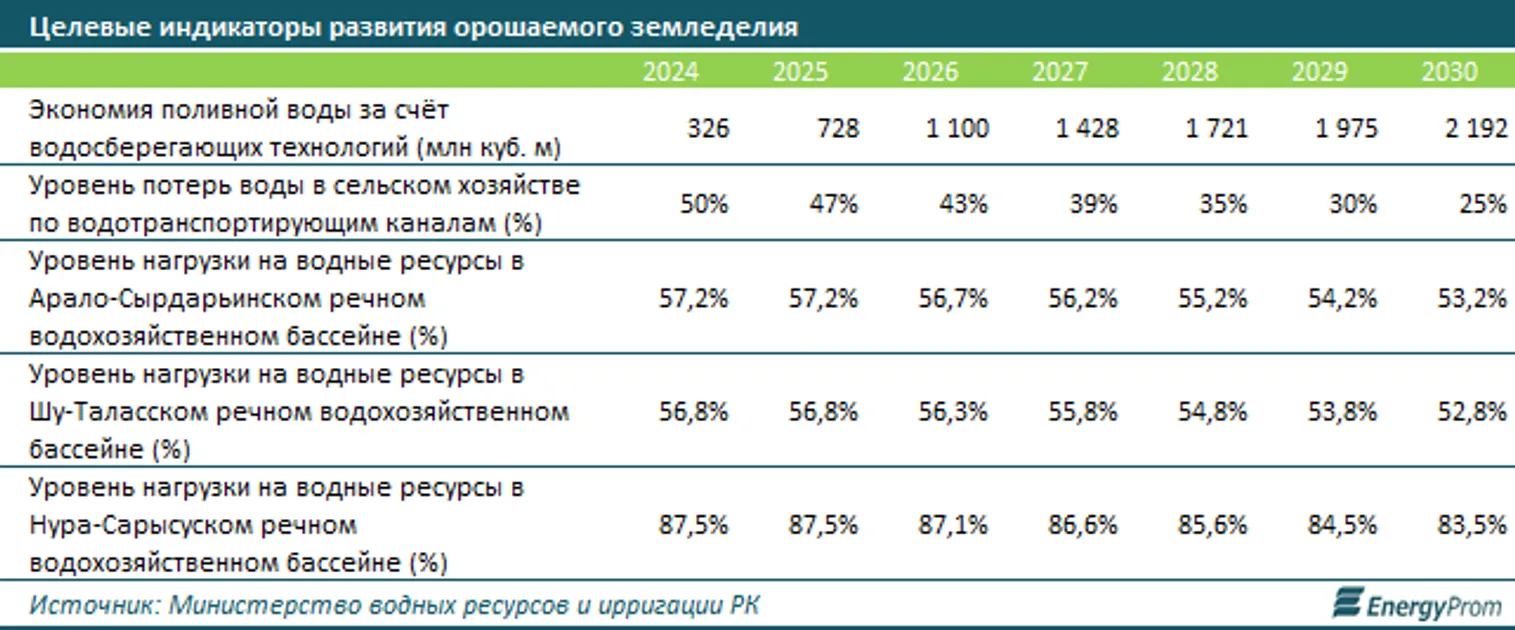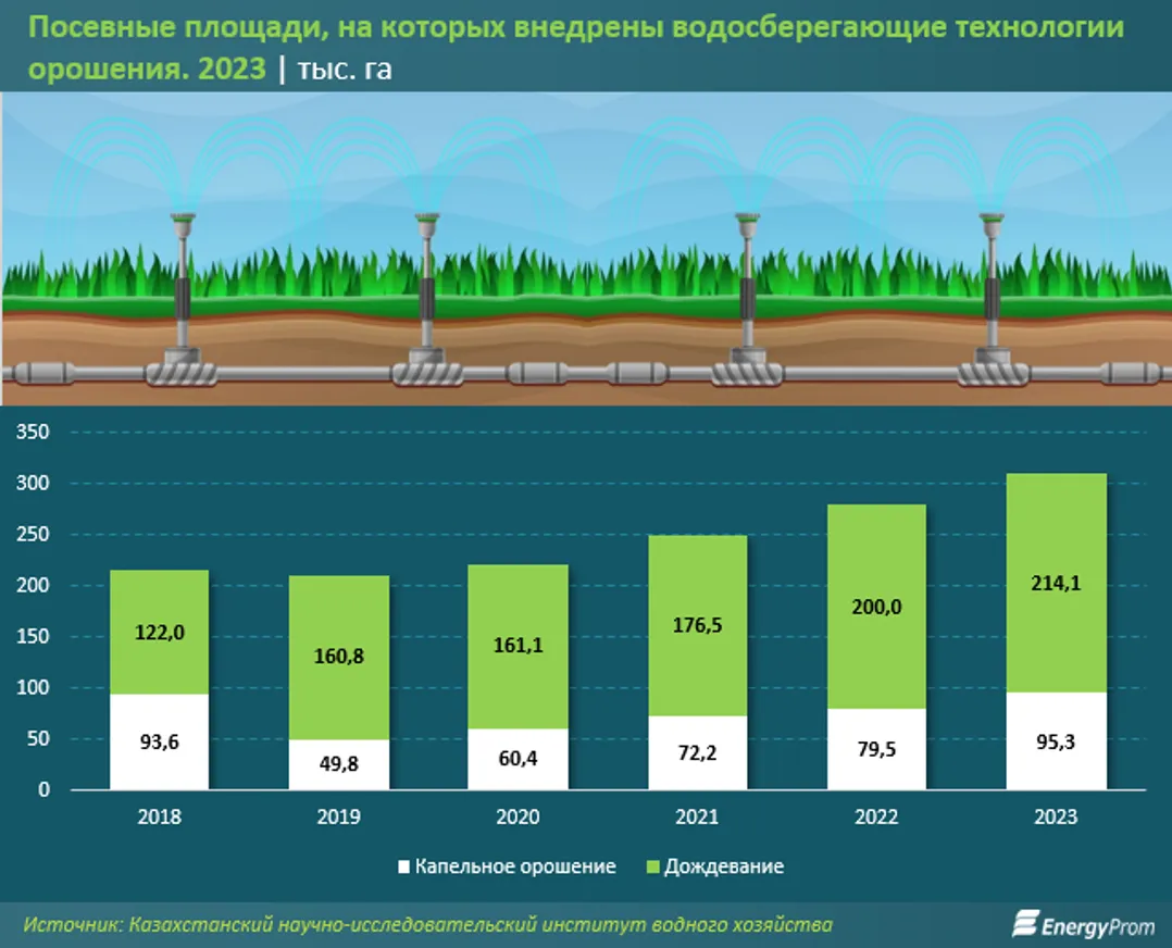 По данным из Концепции развития системы управления водными ресурсами Республики Казахстан на 2024–2030 годы, темпы внедрения водосберегающих технологий орошения в РК в среднем составляют 30 тыс. гектаров в год, при минимально необходимом уровне в 150 тыс. гектаров.