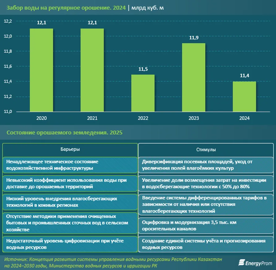 Статистика Министерства водных ресурсов и ирригации (МВРИ) РК показывает, что в последние годы в стране сокращается забор воды из речных бассейнов для нужд орошаемого земледелия. Если в 2020 году на полив было использовано 12,1 млрд куб. м речной воды, то в 2024 году этот показатель уменьшился на 5,8%, до 11,4 млрд куб. м. Более половины этого объема составила вода из Арало-Сырдарьинского водохозяйственного бассейна, ресурсами которого пользуются самые активные южные регионы — Туркестанская и Кызылординская области. Это обусловлено как общим сокращением речных стоков бассейнов, так и их высокой антропогенной нагрузкой.