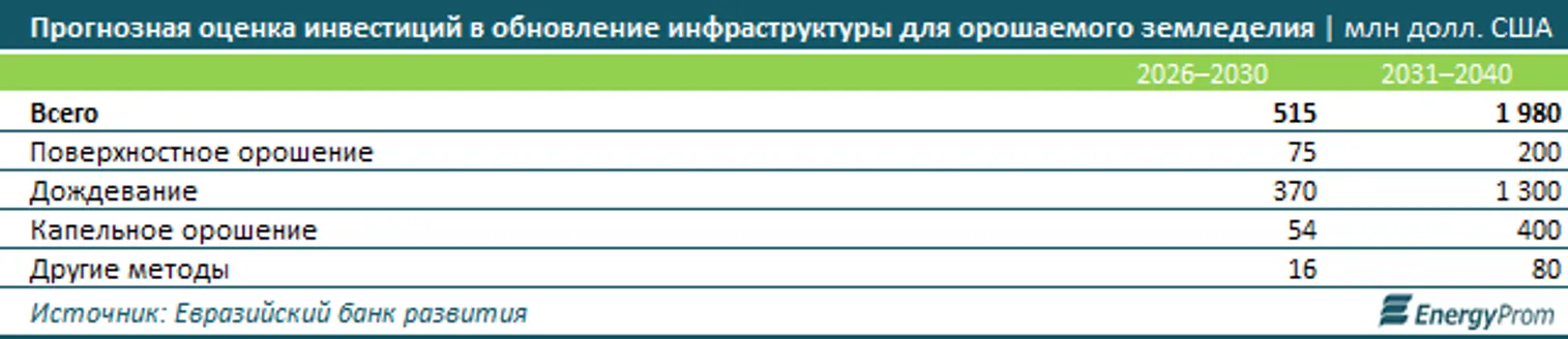 Судя по планам увеличения площадей орошаемых земель в ЦА и по внедрению водосберегающих технологий, в ближайшие годы потребность в таком оборудовании будет только расти. По оценкам специалистов ЕАБР, с 2026 по 2030 год объем инвестиций в совершенствование техник и методов орошения в пяти странах ЦА составит более 2,1 млрд долларов, из которых 515 млн долларов придется на РК. Большая часть этих средств — 370 млн долларов — будет потрачена на покупку оборудования для дождевания. Такой приоритет инвестиционных интересов останется и после, в период с 2031 по 2040 год. Общая сумма инвестиций в орошаемое земледелие Казахстана в следующем десятилетии приблизится к 2 млрд долларов.