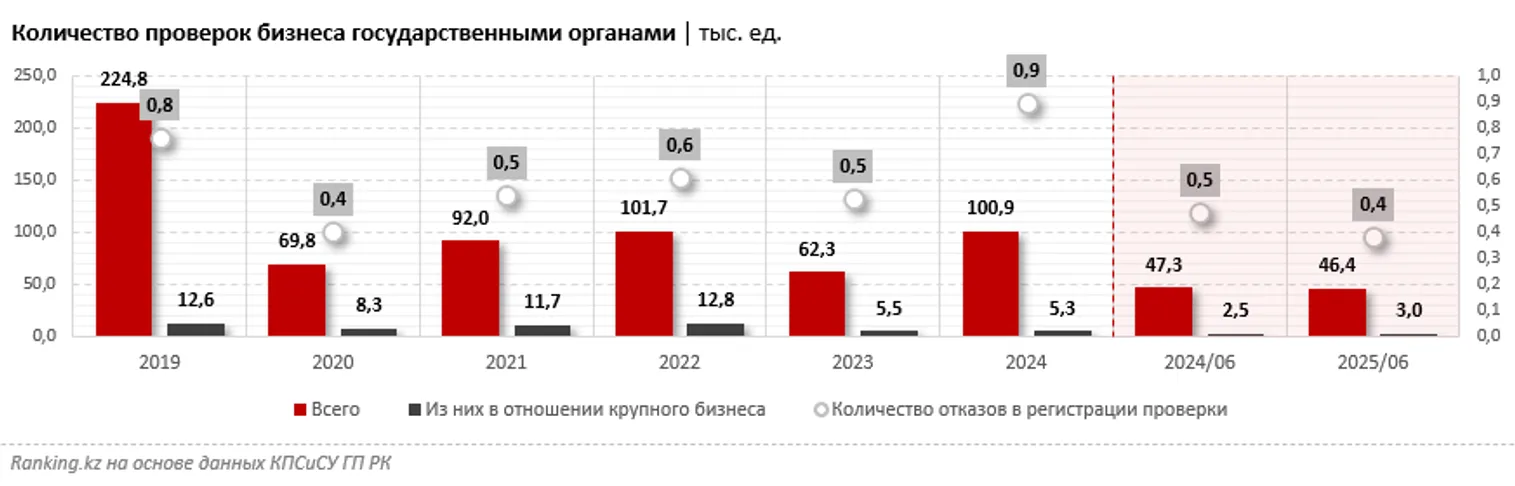 От частного — защиты инвесторов — перейдём к вопросам защиты бизнеса в целом. Если говорить обо всех видах проверок субъектов предпринимательства, то лишь в 1% случаев государственным органам отказывают в регистрации таких проверок. В 99% случаев чиновники получают разрешение на инспекцию. Например, за прошлый год в РК было зарегистрировано 100,9 тыс. проверок субъектов предпринимательства — на 62% больше, чем за 2023-й. При этом представители государственных органов получили всего 898 отказов в проведении контроля.
