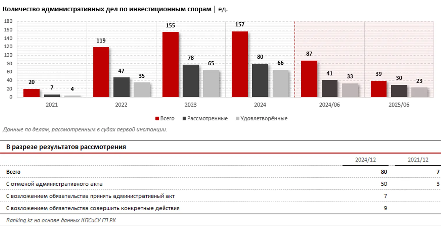 За три года в Казахстане резко увеличилось количество административных дел по инвестиционным спорам, рассматриваемым в судах первой инстанции. По данным, полученным по запросу редакции Ranking.kz от Комитета по правовой статистике и специальным учётам Генеральной прокуратуры (КПСиСУ ГП) РК, в 2021 году на судебное рассмотрение поступило 20 таких дел, в 2024-м — уже 157. Рост — почти в 8 раз. Из них в 2021 году было рассмотрено 7, а в прошлом году — 80 дел. В первом полугодии 2025-го ситуация изменилась: количество поступивших в суды дел сократилось в 2 раза.