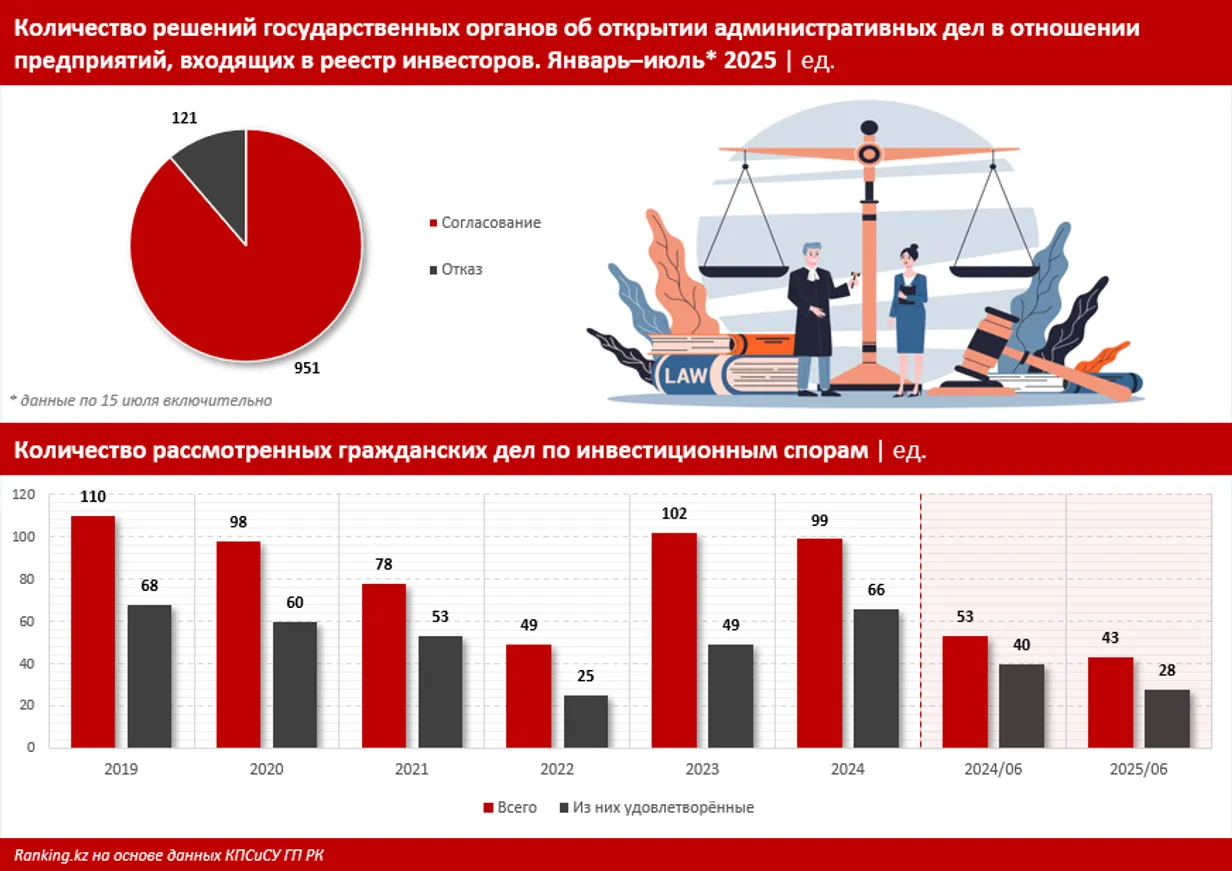 «С начала года по 15 июля прокурорами согласовано возбуждение 951 административного дела по инвестспорам. Отказано инициаторам в открытии 121 административного дела (11,3%)», — сообщил в ответ на запрос редакции первый заместитель председателя КПСиСУ ГП РК Руслан Алькенев.