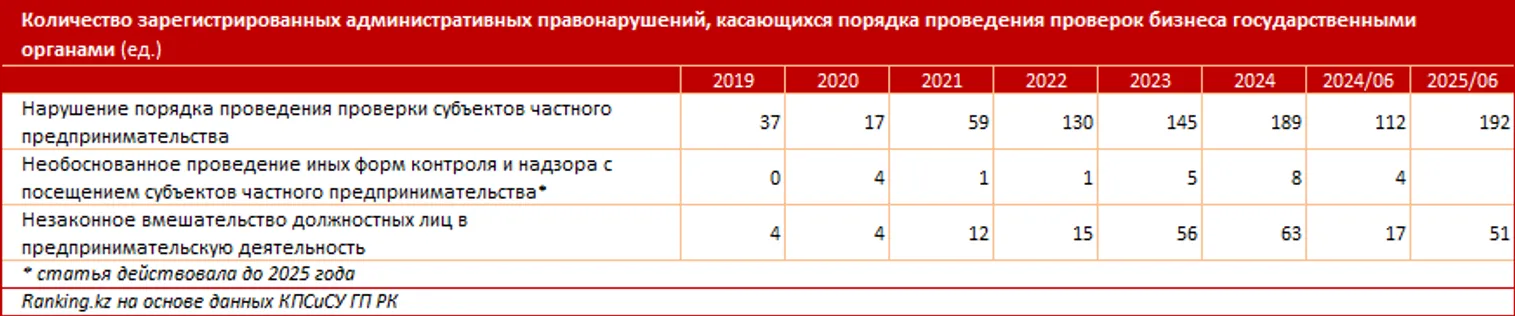 Статистика подтверждает: в последние несколько лет количество случаев незаконного вмешательства государственных органов в предпринимательскую деятельность растёт. По данным КПСиСУ ГП РК, в 2024-м было зарегистрировано 63 административных правонарушения по статье КоАП «Незаконное вмешательство должностных лиц в предпринимательскую деятельность» — в 15 раз больше, чем в 2019 году. За первое полугодие 2025-го насчитывается уже 51 подобное правонарушение — в 3 раза больше, чем годом ранее.