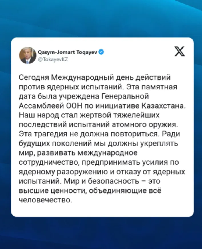 «Ради будущих поколений мы должны укреплять мир. Сегодня Международный день действий против ядерных испытаний. Эта памятная дата была учреждена Генеральной ассамблеей ООН по инициативе Казахстана. Наш народ стал жертвой тяжелейших последствий испытаний атомного оружия. Эта трагедия не должна повториться. Ради будущих поколений мы должны укреплять мир, развивать международное сотрудничество, предпринимать усилия по ядерному разоружению и отказу от ядерных испытаний. Мир и безопасность – это высшие ценности, объединяющие все человечество», – написал президент на своей странице в социальной сети Х.