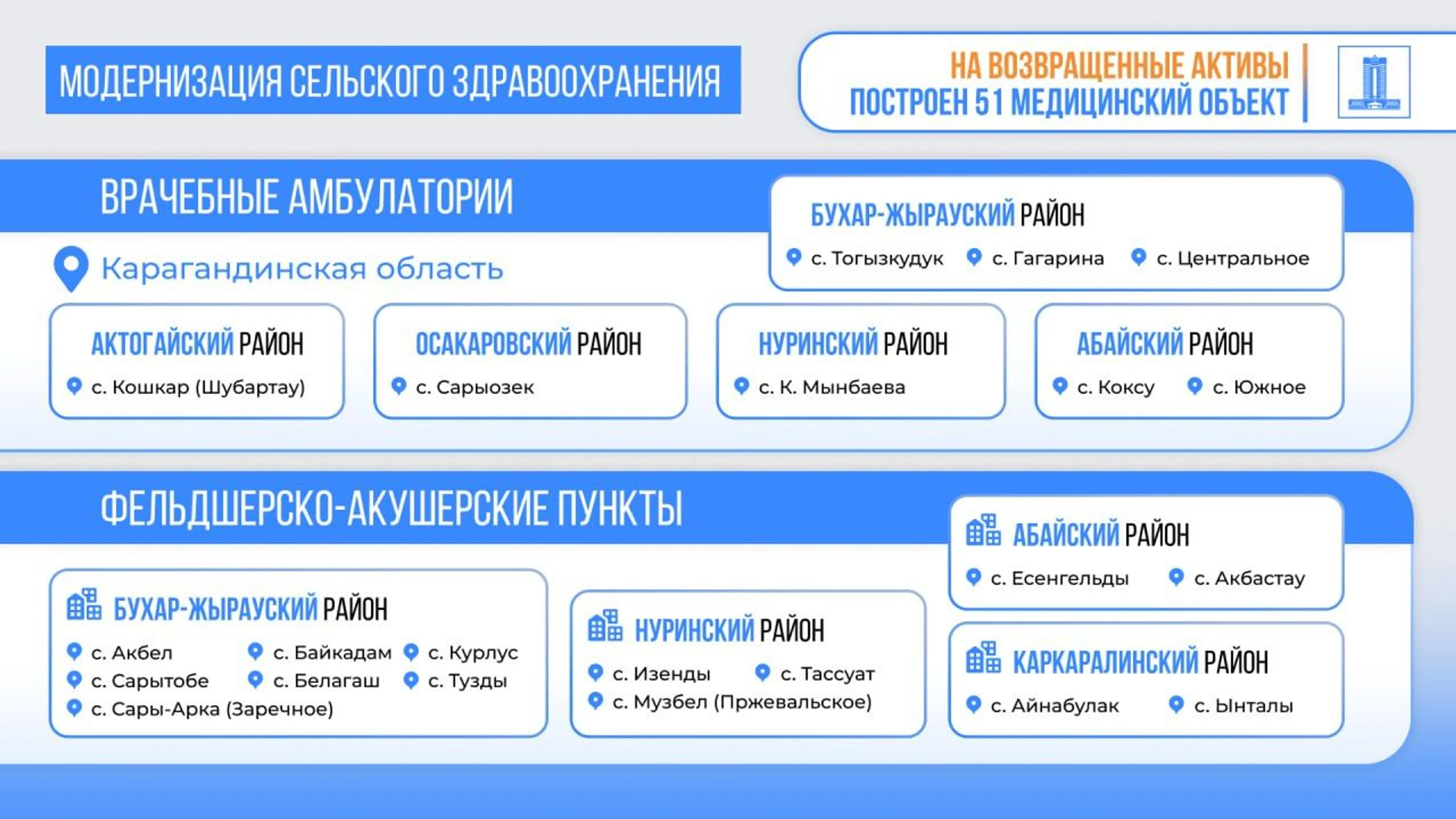 Всего на возвращенные государству активы в Нуринском районе построено 10 объектов – медицинские пункты, фельдшерско-акушерские пункты и одна врачебная амбулатория. В Бухар-Жырауском районе за счет возвращенных активов построили 13 современных медицинских объектов. Девять объектов возвели в Актогайском районе, восемь – в Абайском, пять – в Осакаровском, четыре – в Каркаралинском и два – в Шетском.