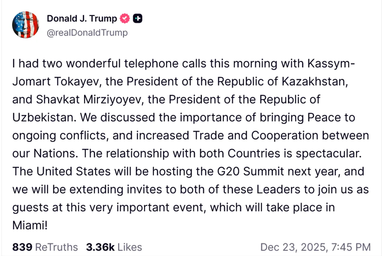 В свою очередь президент США в социальной сети Truth Social сообщил, что провел два телефонных разговора - с президентом Казахстана и президентом Узбекистана, обсуждались важность достижения мира в текущих конфликтах, а также расширение торговли и сотрудничества между странами. Дональд Трамп добавил, что в 2026 году в Майами состоится саммит G20. Он направит обоим лидерам приглашения посетить это мероприятие «в качестве гостей».