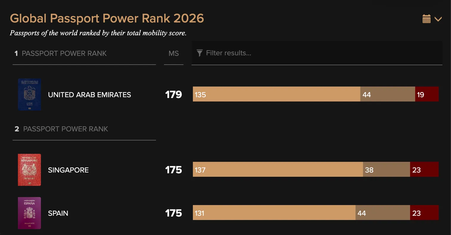 В 2026 году первое место в мировом рейтинге силы паспорта Passport Index по-прежнему занимают Объединенные Арабские Эмираты (ОАЭ), сообщает корреспондент центра деловой информации Kapital.kz. Стране присудили 179 баллов по показателю свободы передвижения (mobility score). Так, для граждан ОАЭ безвизовый режим действует в 135 странах, еще в 44 визу можно получить по прибытии, и лишь в 19 государствах требуется виза.