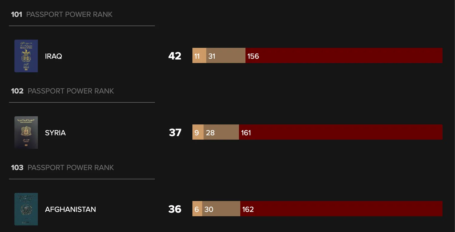 Последнюю, 103-ю строчку в рейтинге занимает Афганистан (36 баллов). Для граждан этого государства безвизовый режим действует только в шести странах, еще в 30 визу можно получить по прибытии и в 162 виза требуется.