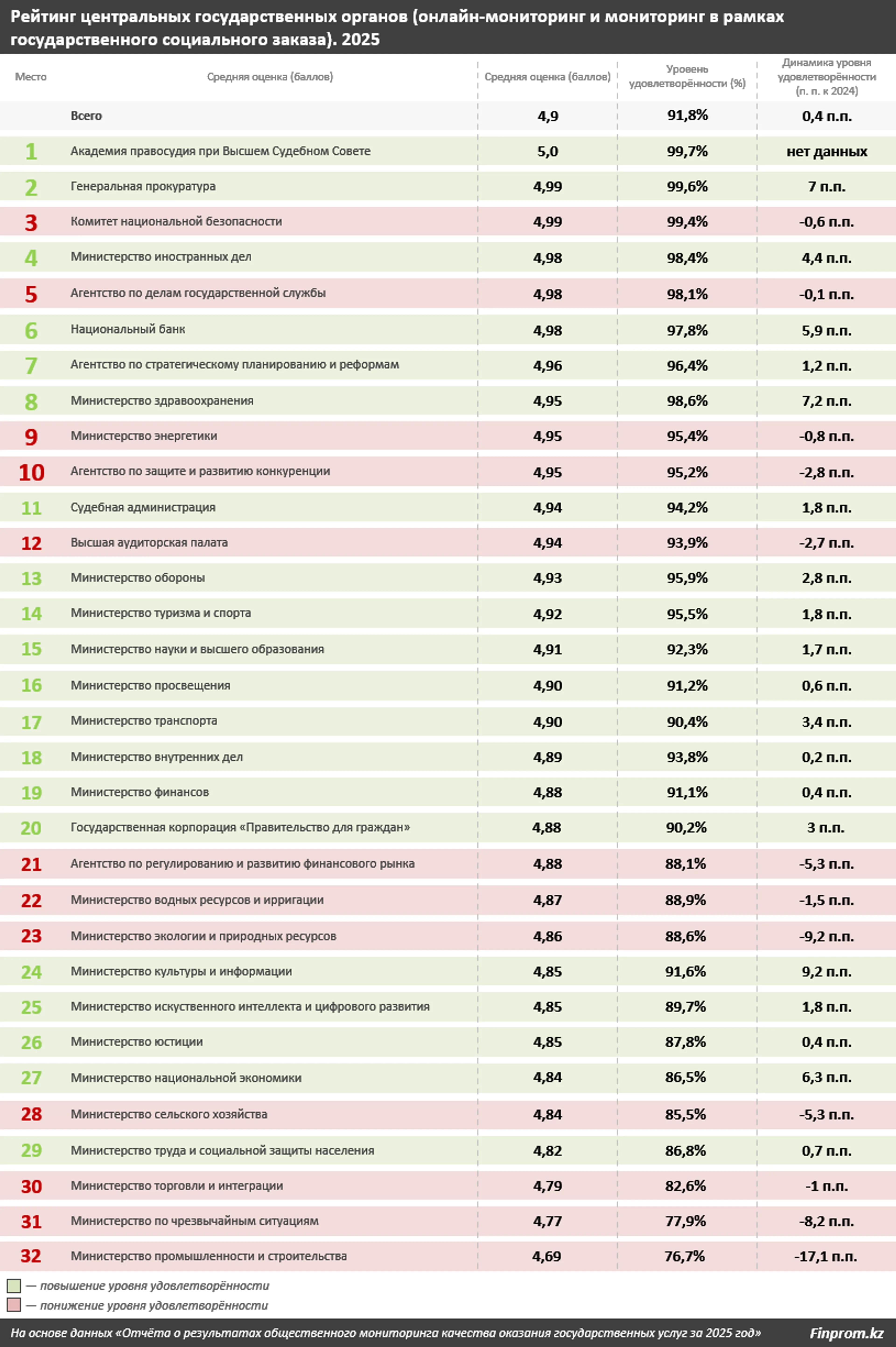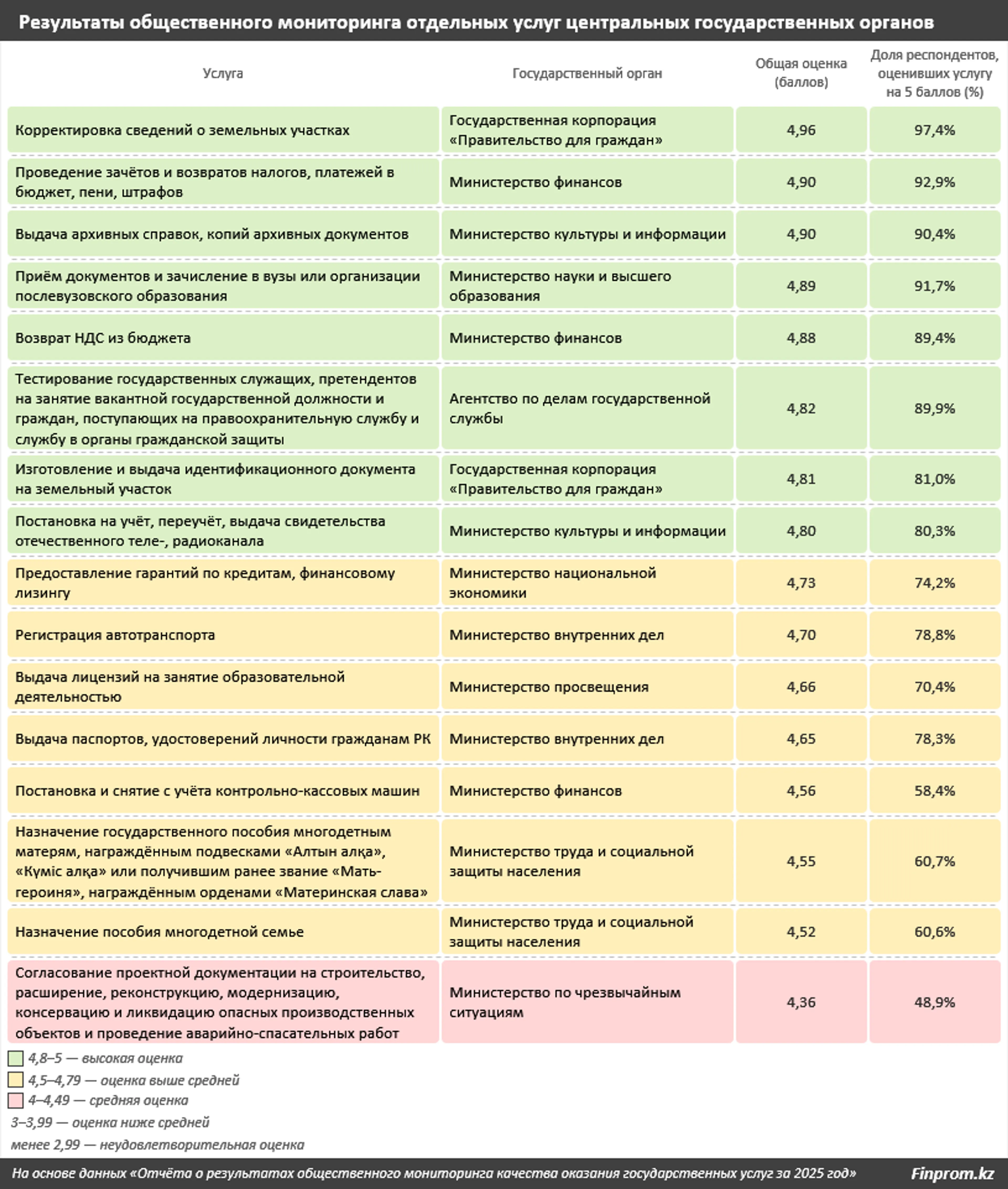 Согласно шкале значений, 29 из 32 министерств и ведомств из числа центральных государственных органов в 2025 году были оценены очень высоко (более 4,8 балла). Только три ведомства — Министерство промышленности и строительства РК, Министерство по чрезвычайным ситуациям РК и Министерство торговли и интеграции РК — получили оценки выше средней (от 4,69 до 4,79 балла). Уровень удовлетворённости респондентов услугами этих организаций был куда ниже, чем у лидеров рейтинга (от 77% до 83%).