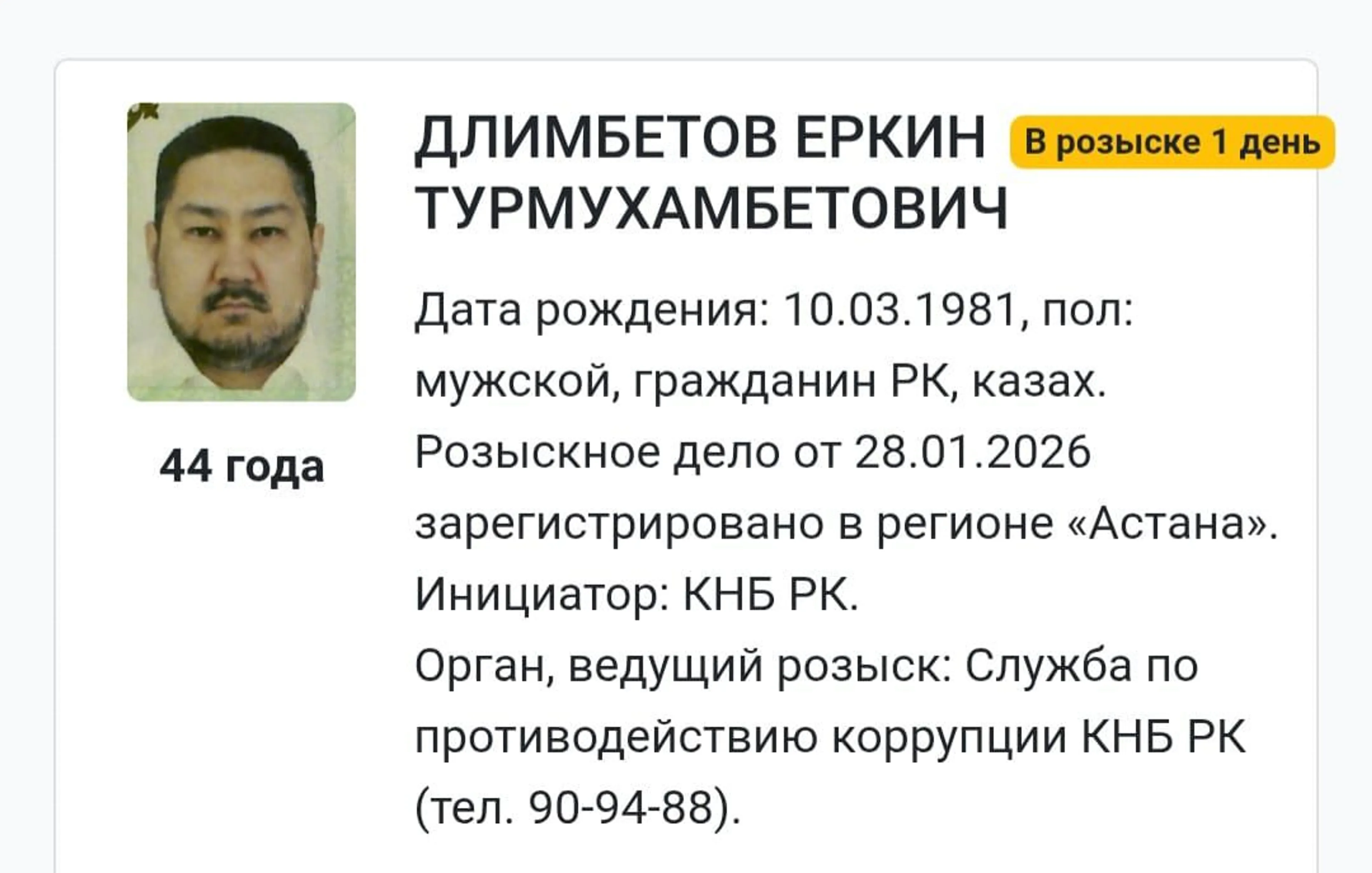 Служба по противодействию коррупции Комитета национальной безопасности Казахстана объявила основателя и руководителя компании OrdaMed Еркина Длимбетова в розыск. Объявление размещено на портале органов правовой статистики, передает центр деловой информации Kapital.kz.