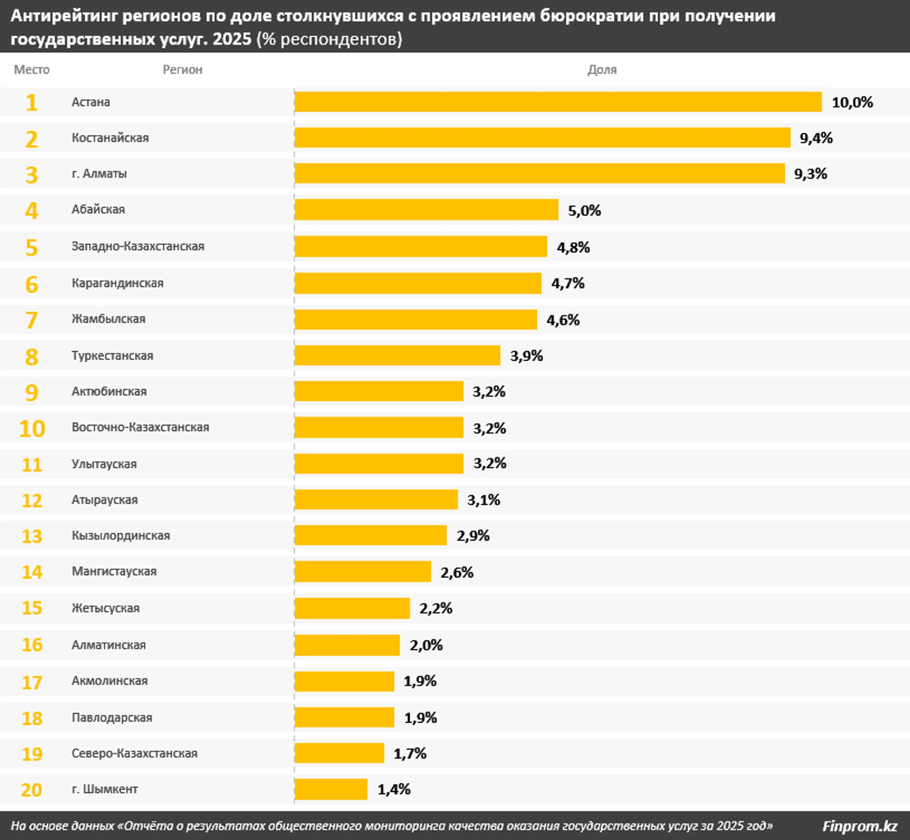 Перейдем непосредственно к итогам антирейтинга. Наибольшая частота столкновения опрошенных с бюрократией была зафиксирована в Астане (10% респондентов), Костанайской области (9,4%) и Алматы (9,3%). Это может свидетельствовать о существенных сложностях в работе местных государственных органов — длинных очередях, избыточном документообороте, сложностях с получением услуг в электронном формате или низкой клиентоориентированности сотрудников. Одной из причин антилидерства Астаны может также служить концентрация всех центральных государственных органов в этом городе.