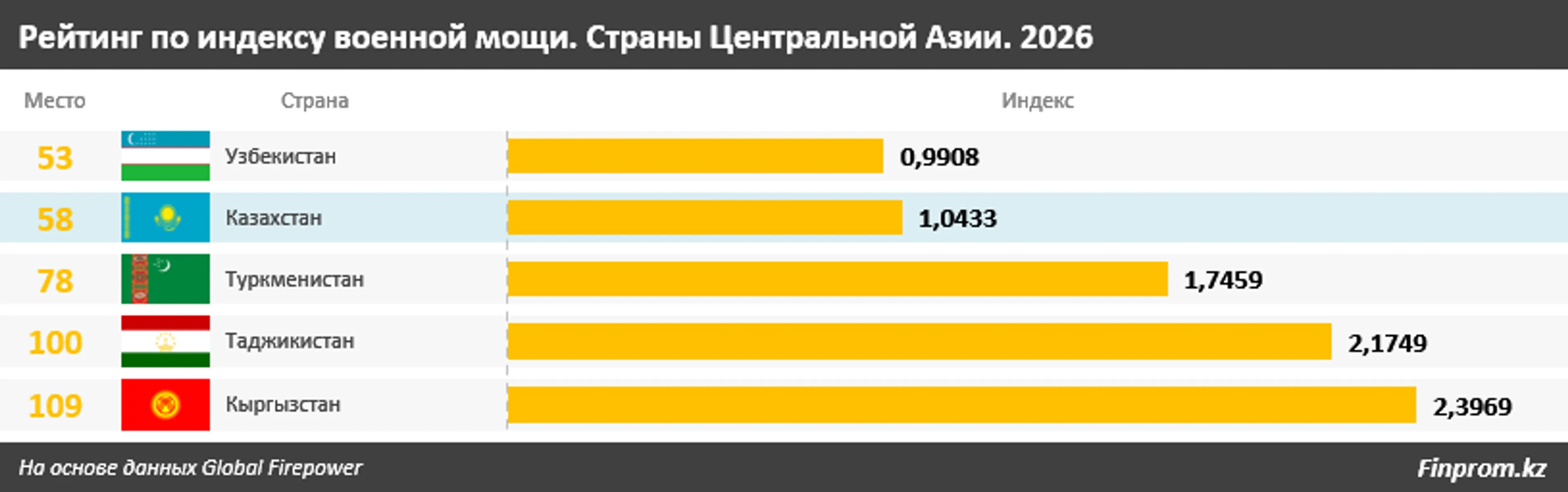 В Центральной Азии также прослеживается собственная иерархия военной мощи. Лидером региона в 2026 году становится Узбекистан, поднявшийся на 53-е место в мировом рейтинге. Казахстан занимает 58-е место в мире и имеет статус второй военной силы региона, однако без заметного улучшения позиций за последний год. Многолетняя динамика показывает, что именно Узбекистан демонстрирует наиболее устойчивый рост военного потенциала, тогда как Казахстан по большей части удерживает достигнутый уровень.