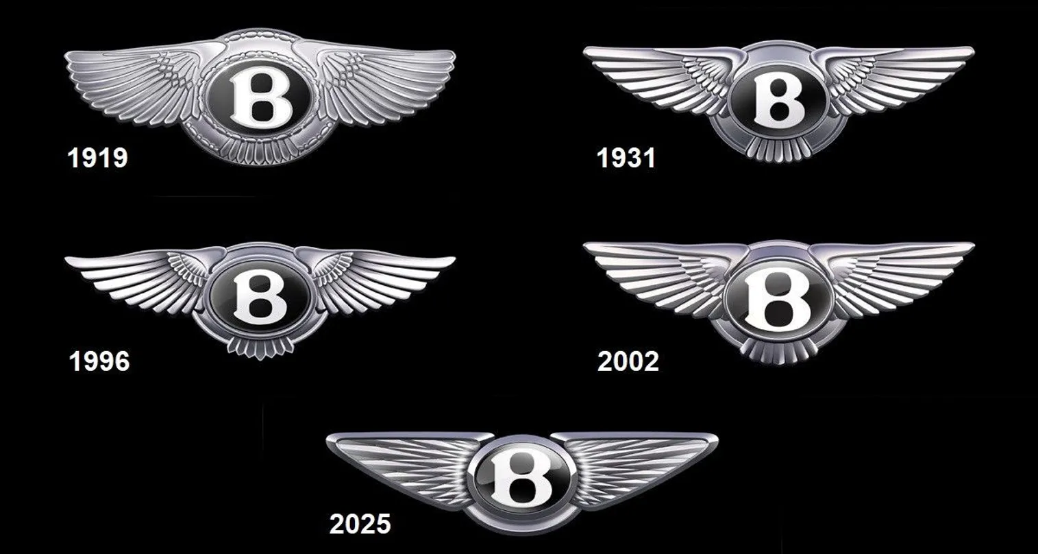 В первоначальном виде логотип существовал до 1931 года, когда Bentley была куплена компанией Rolls-Royce. К этому событию было приурочено первое обновление эмблемы. Следующая метаморфоза произошла только в 1996 году, когда в честь Кросби логотипу вернули трехмерность и сделали его более выразительным. Использовавшееся до сих пор лого появилось в 2002 году, когда вошедшая в состав концерна Volkswagen компания Bentley готовилась к выпуску принципиально новой модели – купе Continental GT.