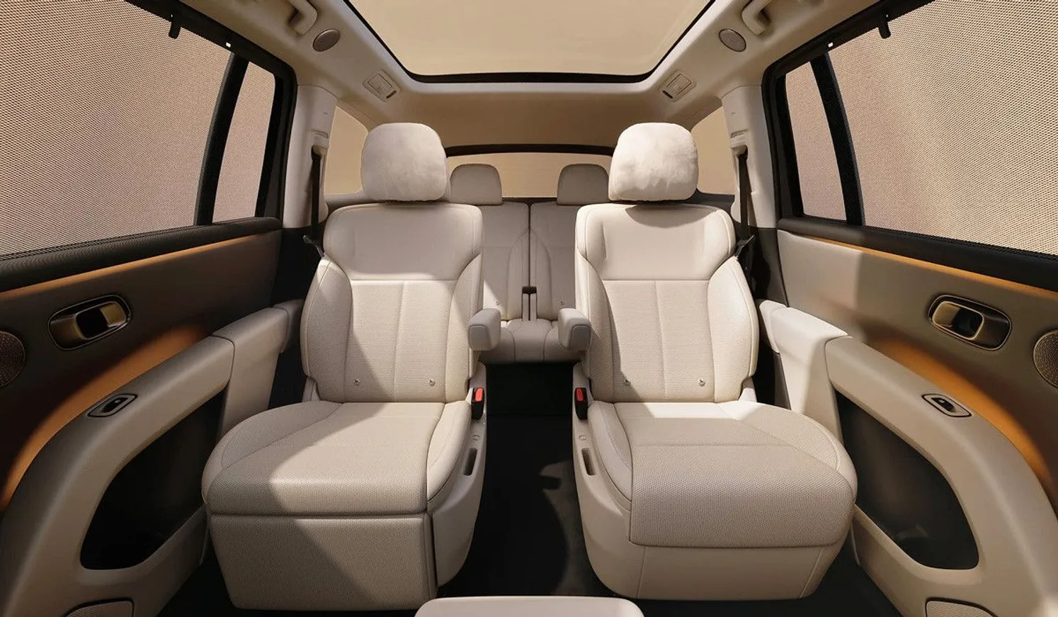 i8 имеет трехрядный 6-местный салон, причем на первом и втором рядах установлены почти одинаковые сиденья с широким набором электрорегулировок, подогревом, вентиляцией и массажем. Это особо комфортные кресла новой серии Sofa 3.0, которые имеют верхний слой из пенистого наполнителя толщиной 30 мм. Правое кресло второго ряда может обеспечить полулежачее положение: спинка откидывается на 78 градусов, плюс имеется подставка для ног.