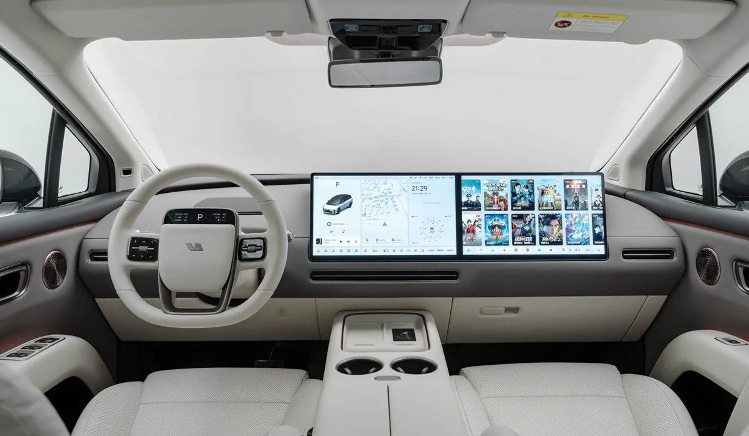 Кроссвэн штатно имеет люк спереди и панорамную крышу над пассажирским отсеком, а в перемычке между ними встроен откидной экран диагональю 21 дюйм, предназначенный для развлечения задних пассажиров. Есть трехзонный климат-контроль, откидные столики и шторки на окнах. На полноценном третьем ряду — двухместный диван с подогревом и электроприводом складывания спинок. Передняя панель типична для моделей Li. Полноценного приборного экрана нет, вместо него — проекционный дисплей и небольшой экранчик на ступице руля.