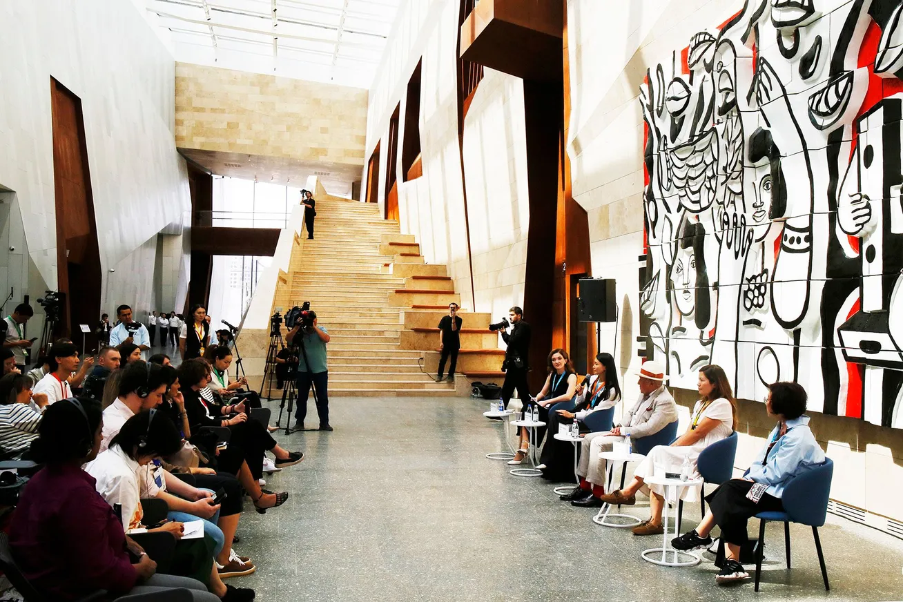 На вопрос журналистов о первой зарубежной выставке Меруерт Калиева ответила следующее: «Первую зарубежную выставку мы планируем летом 2026 года. Пока деталями не делимся, но обязательно об этом расскажем. Проекты с международными институциями, которыми уже можем поделиться: 3-4 октября у нас пройдет совместная конференция с лондонским музеем Tate Modern. Это будет конференция, посвященная искусству Центральной Азии и Кавказа – будет серия дискуссий, круглых столов и перформансов».