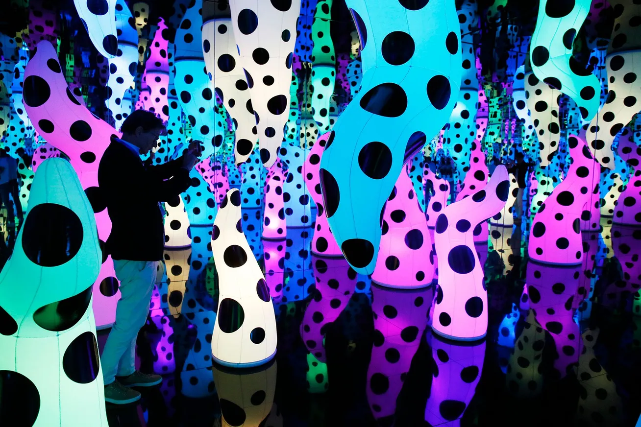 На протяжении нескольких десятилетий Яёи Кусама делает так называемые «комнаты бесконечности» – иммерсионные инсталляции, в которых посетители оказываются окруженными различными формами, украшенными в характерный горошек и зеркалами, которые создают ощущение калейдоскопа. «Комната бесконечности» Almaty Museum of Arts «Любовь зовет» (2013) является самой большой инсталляцией из этой серии и сопровождается звуковой дорожкой, в которой художница декламирует поэму собственного сочинения на японском языке. «Комнаты бесконечности» экспонировались во многих музеях мира, и каждый раз вокруг музеев выстраивались очереди.