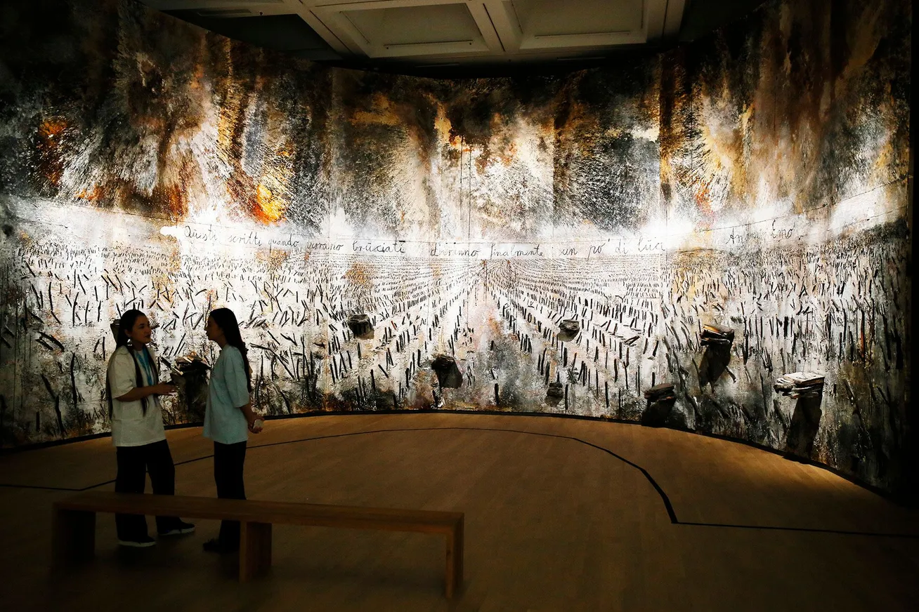 В 2022 году во время Венецианской биеннале (художественная выставка, которая проходит раз в два года – Ред.) Almaty Museum of Arts приобрел монументальную инсталляцию длиной в 9 метров под названием «Когда эти сочинения сожгут, они наконец дадут немного света». Ее автор – немецкий художник Ансельм Кифер. Инсталляция является одним из его самых значимых произведений. Она была представлена на показе художника во Дворце Дожей в Венеции и посвящена трудам итальянского философа Андреа Эмо – автора фразы, которая легла в название работы и всей выставки.