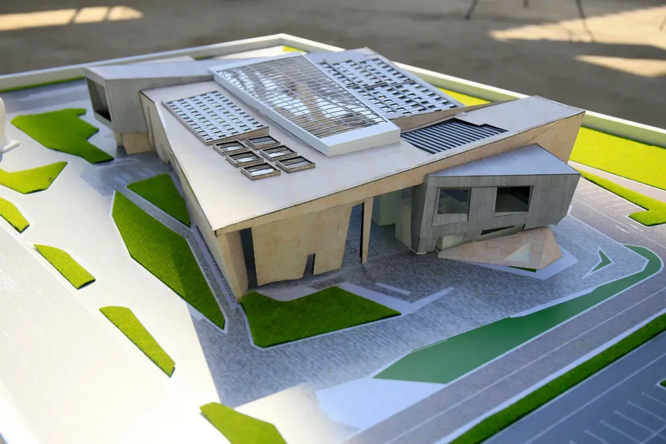 Выбранные материалы для облицовки фасада – юрский известняк, олицетворяющий Горы, и анодированный алюминий, символизирующий Город.