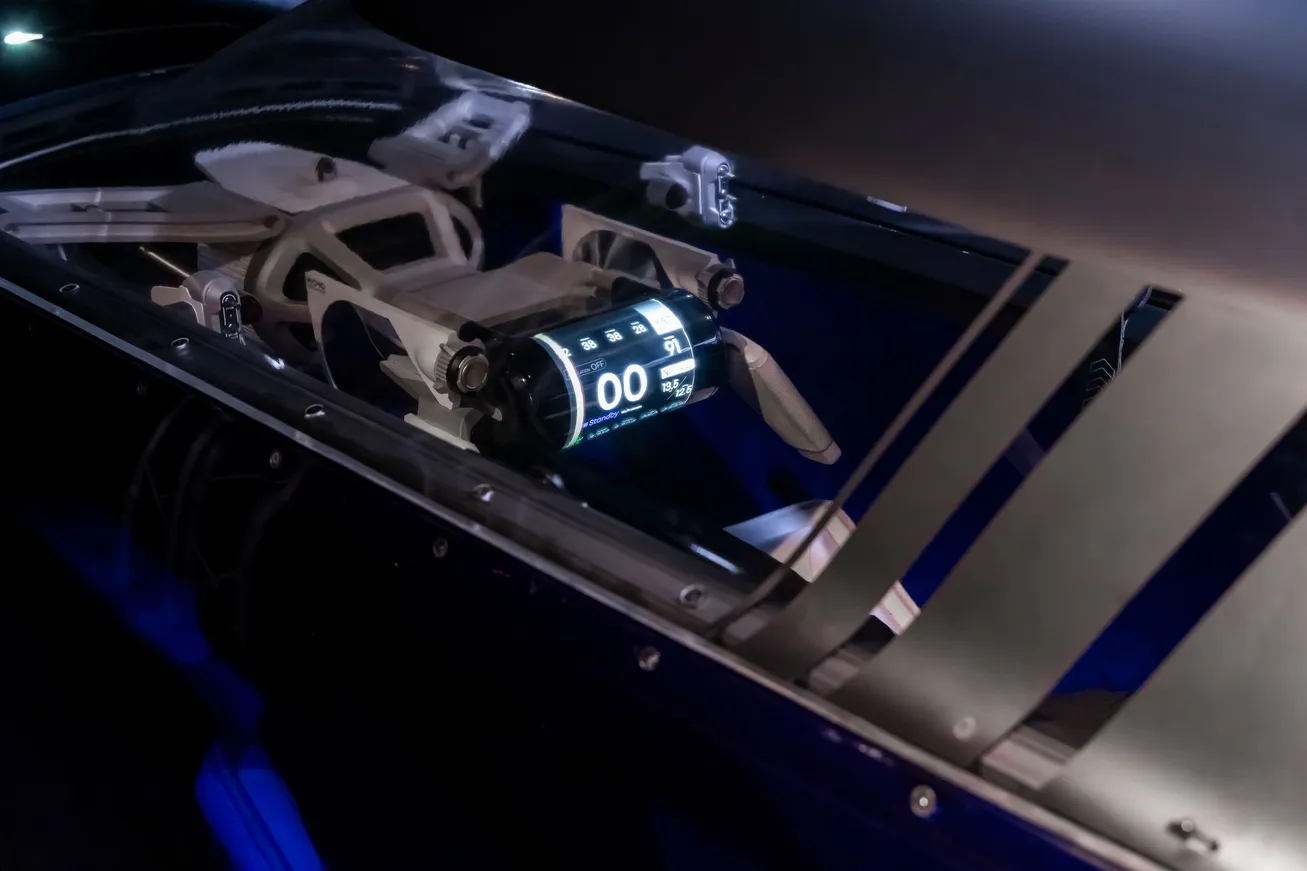 Кокпит ездового образца сохранил концепцию изначального прототипа. Он рассчитан лишь на водителя, который размещается в полулежачем положении. Педали не предусмотрены, а разгоном и торможением нужно управлять при помощи штурвала с закрепленной на нем «приборкой». Дверей тоже нет: доступ в салон открывает поднимающийся колпак, вместе с которым для более удобной посадки и высадки поднимается рулевая колонка. Платформа, шасси и монокок из карбона от французской фирмы Ligier также соответствуют изначальным расчетам. Тяговая батарея имеет емкость 87 кВт⋅ч и весит 600 кг, а масса всего автомобиля не превышает 1000 кг.