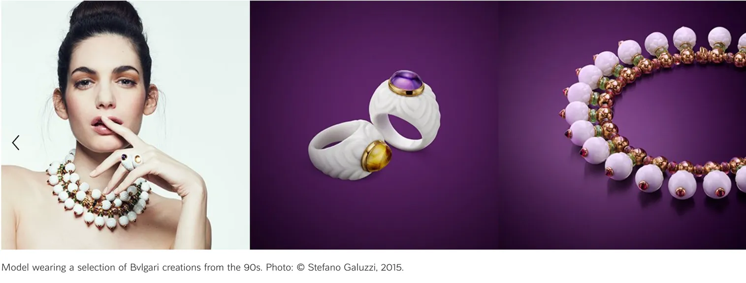 Это позволяло учитывать потребности любой женщины и предлагать украшения из материалов различных ценовых категорий. Эксперименты ювелиров BVLGARI привели к появлению целого ряда украшений и часов из нетрадиционных материалов (сталь, фарфор, шелк и дерево), что раздвинуло границы роскоши и подняло ювелирное искусство на новые высоты.
