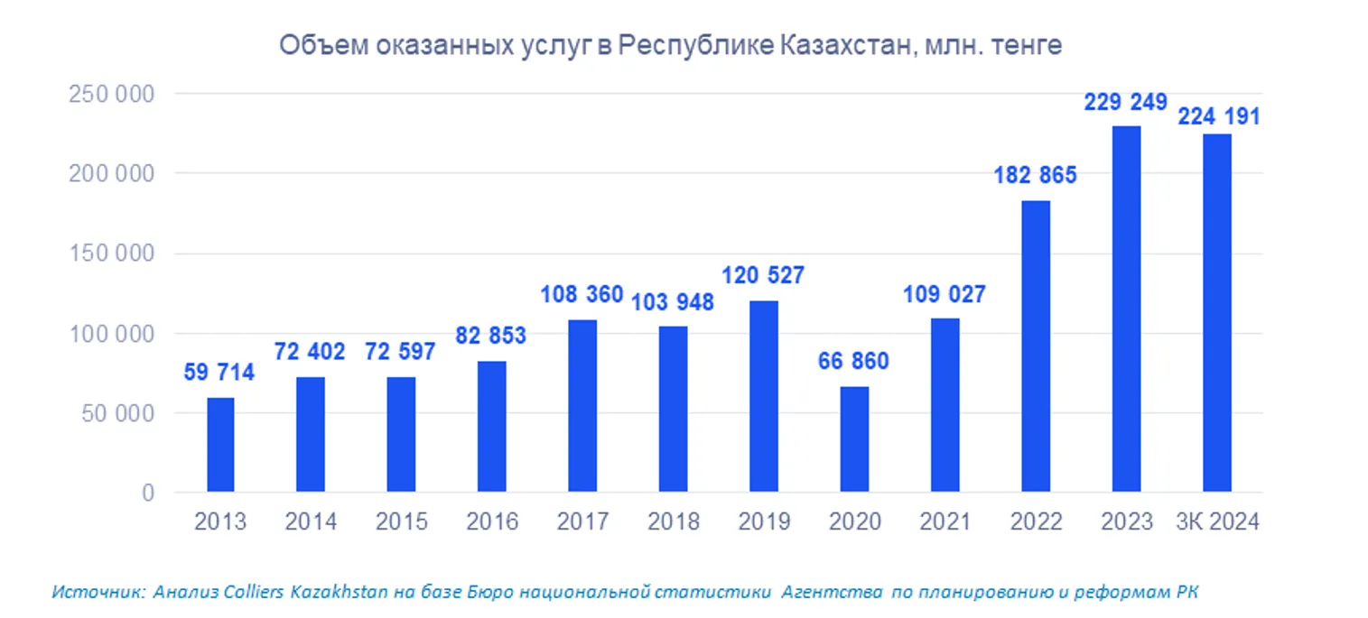 Как представлено на графике выше, в 2013 году объём оказанных услуг в сфере размещения составил 59,7 млрд тенге. К третьему кварталу 2024 года показатель вырос до 224,2 млрд тенге, что свидетельствует о динамичном росте отрасли, обусловленном увеличением туристического спроса и развитием инфраструктуры в Казахстане. Среднегодовой темп роста за данный период составил 12,78%. С учётом текущих тенденций, повышения качества сервисов и активной государственной поддержки, в краткосрочной перспективе (2024–2026 гг.) ожидается сохранение темпов роста на уровне 12–13% в год.