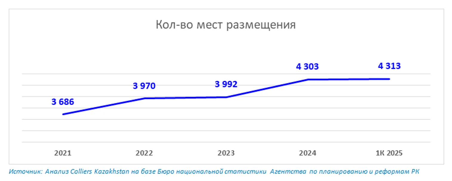 График наглядно демонстрирует устойчивый рост количества мест размещения в Казахстане - с 3 686 в 2021 году до 4 313 в первом квартале 2025 года. Такая динамика отражает повышение туристической активности и общее развитие сектора гостеприимства. Увеличение объёмов услуг подтверждает потенциал отрасли и необходимость дальнейшего совершенствования инфраструктуры размещения.