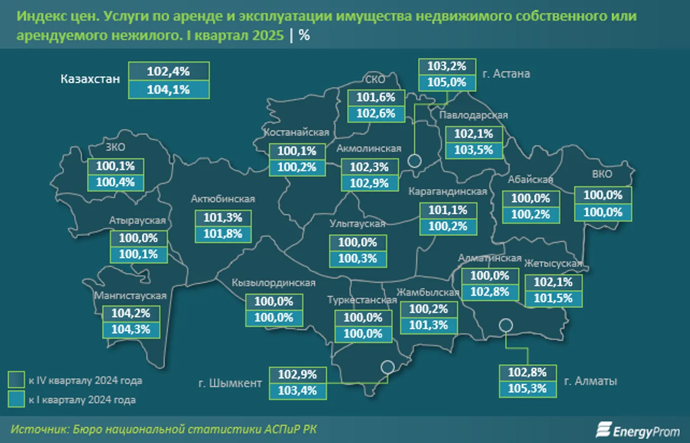 В годовой динамике цены на аренду коммерческой недвижимости сильнее всего выросли в Алматы — на 5,3%, в Астане — на 5% и в Мангистауской области — на 4,3%. Наименьший годовой рост зафиксирован в Атырауской области — 0,1%. В Восточно-Казахстанской, Кызылординской и Туркестанской областях цены остались на уровне прошлого года.