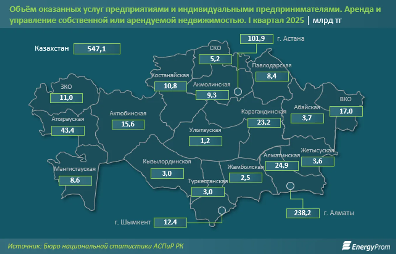Тем временем объем услуг по аренде и управлению собственной или арендуемой недвижимостью в первом квартале 2025 года составил 547,1 млрд тенге — на 37,9% больше в стоимостном выражении, чем в первом квартале прошлого года.