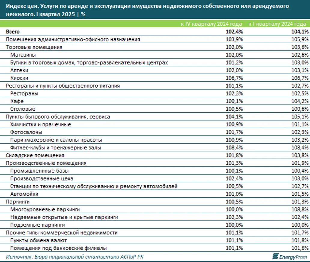 Вернемся в Казахстан. По итогам первого квартала текущего года помещения бытового обслуживания и сервиса подорожали на 4,1% за квартал пункты, помещения административно-офисного назначения — на 3,9%, торговые помещения — на 2%, складские помещения — на 1,8%, производственные помещения — на 1,3%, рестораны и пункты общественного питания — на 1,1%, паркинги — на 0,5%.