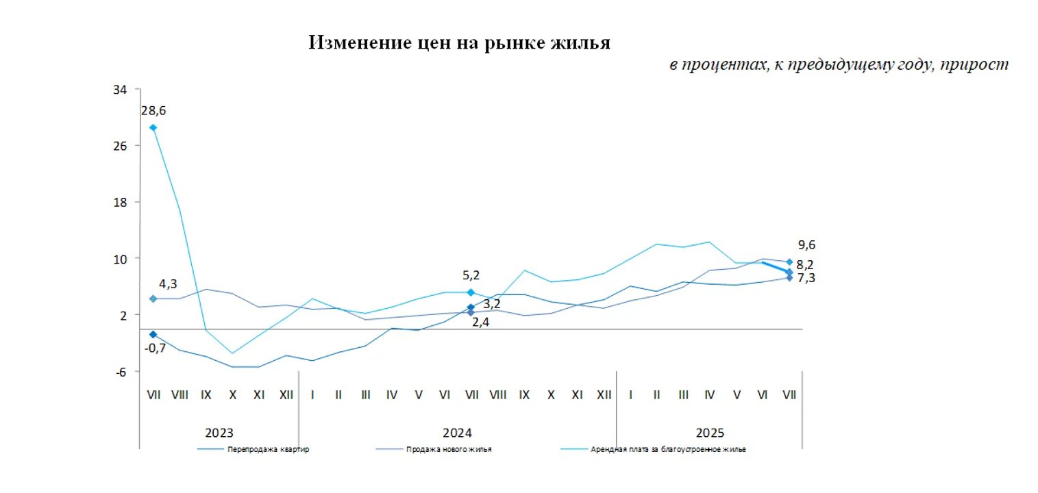 В годовом выражении (июль 2025г. к июлю 2024г.), по данным статведомства, цены на продажу нового жилья повысились на 9,6%, перепродажу квартир вторичного рынка – на 7,3%. Арендная плата за благоустроенное жилье повысилась на 8,2%.