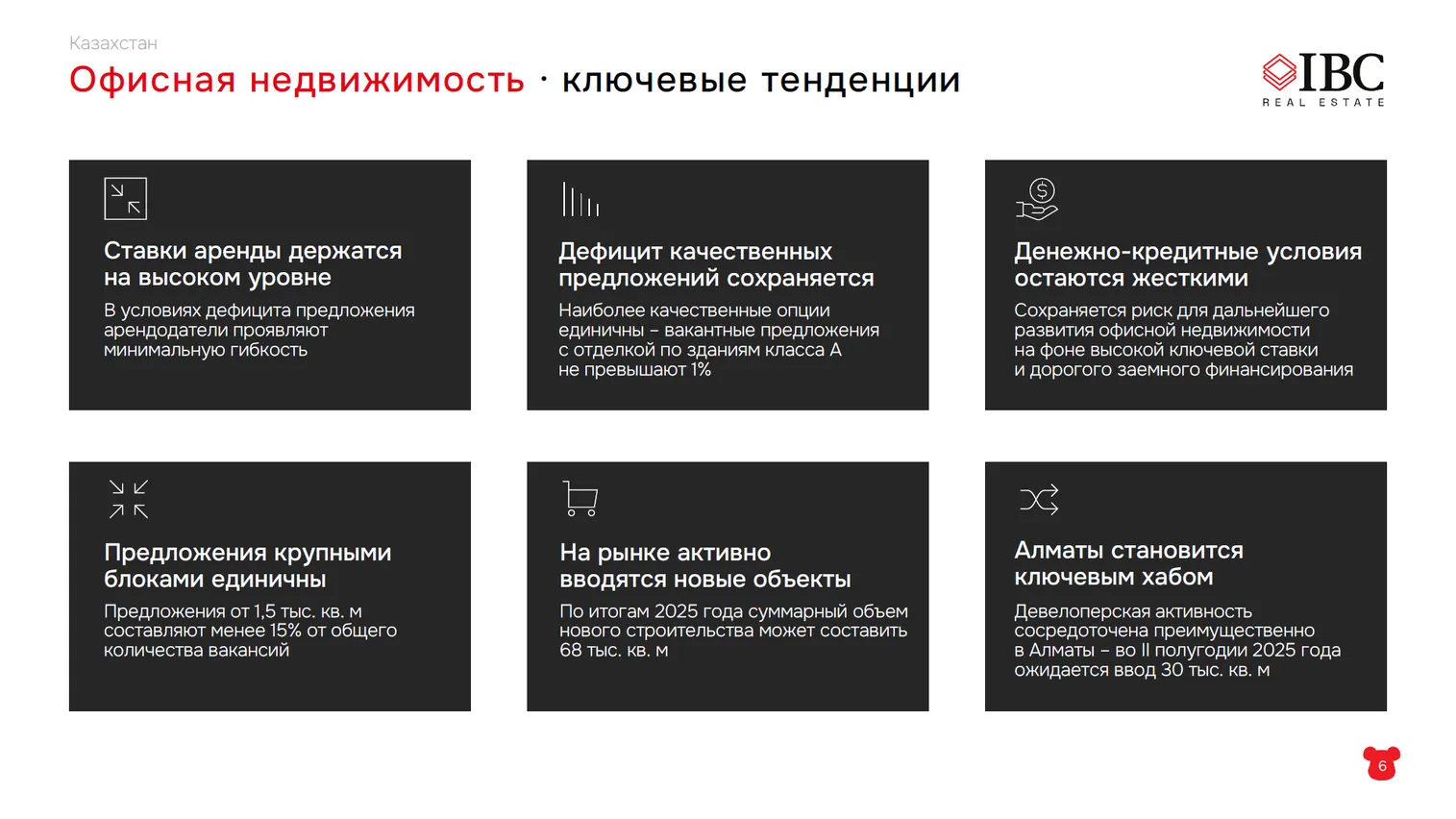 «Общее предложение офисной недвижимости в Казахстане составляет 2,6 млн квадратных метров. Думаю, не секрет, что половина этого количества сосредоточена в Алматы и Астане», – говорит генеральный директор группы компаний IBC Real Estate.