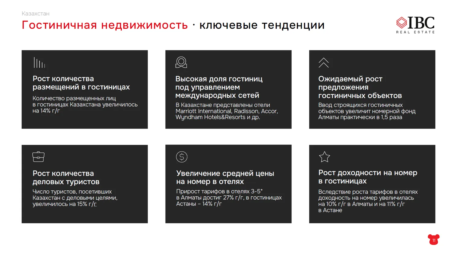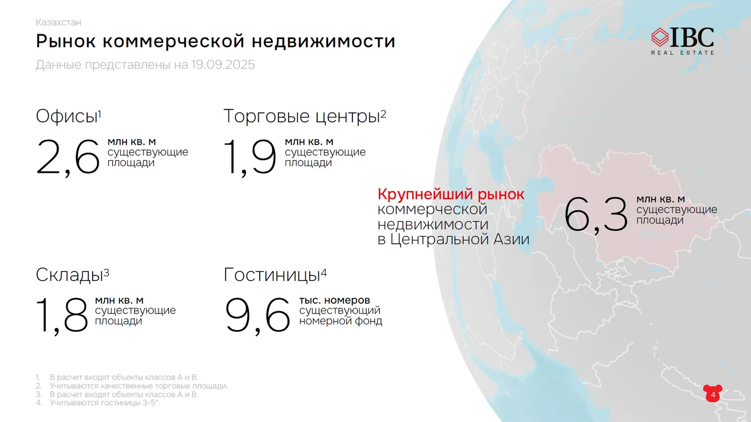 В Казахстане всего 6,3 млн квадратных метров коммерческих площадей: офисы занимают 2,6 млн квадратных метров, торговые центры – 1,9 млн квадратных метров, склады – 1,8 млн квадратных метров. А существующий номерной фонд гостиниц составляет 9,6 тыс. номеров. Такими данными поделился генеральный директор группы компаний IBC Real Estate Алексей Ефимов во время закрытого бизнес-бранча IBC Real Estate, который проходил в Алматы сегодня, 19 сентября, передает корреспондент центра деловой информации Kapital.kz.
