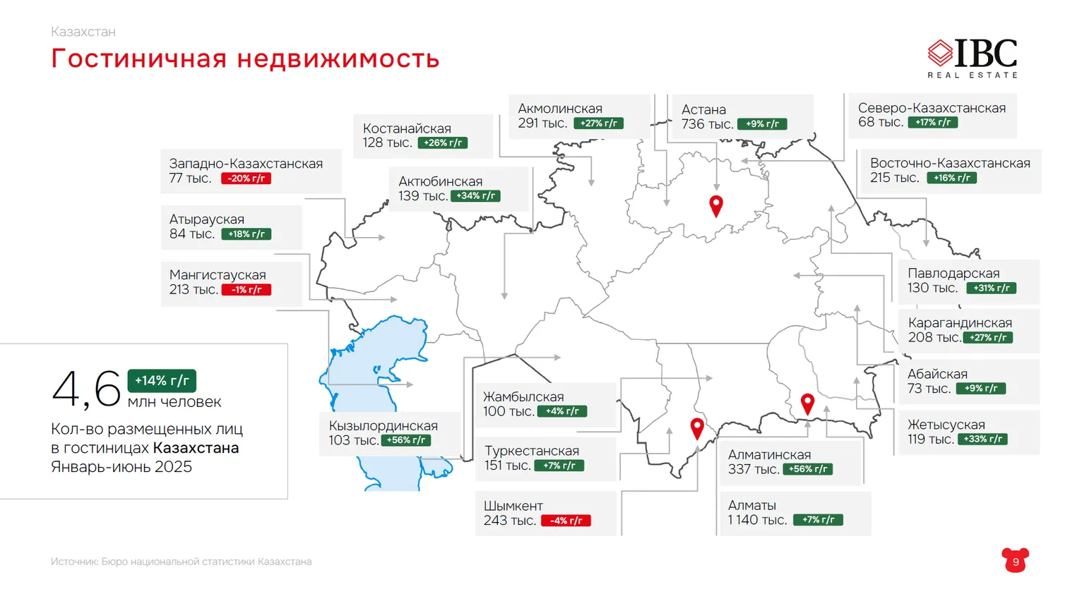 «4,6 млн человек останавливались в гостиницах Казахстана с января по июнь 2025 года – это хороший показатель, – уверен генеральный директор группы компаний IBC Real Estate. – Вы видите по регионам, где и сколько размещалось человек (см. слайд ниже): лидерами по-прежнему – думаю, я вас ничем не удивлю – являются Алматы и Астана».