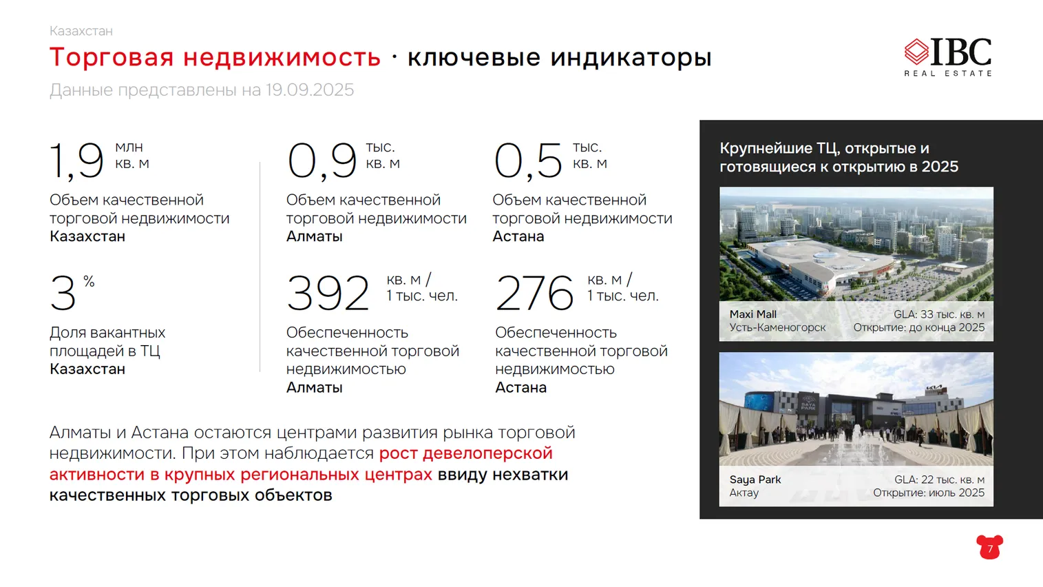 «Общий объем рынка торговых центров Казахстана – почти 2 млн квадратных метров. Доля вакантных площадей – 3%: это очень низкая доля, то есть почти все торговые центры заполнены. Из 1,9 млн квадратных метров почти 1 млн приходится на Алматы и полмиллиона – на Астану, то есть 1,4 млн квадратных метров качественных торговых площадей сконцентрировано в двух городах», – подчеркивает спикер.