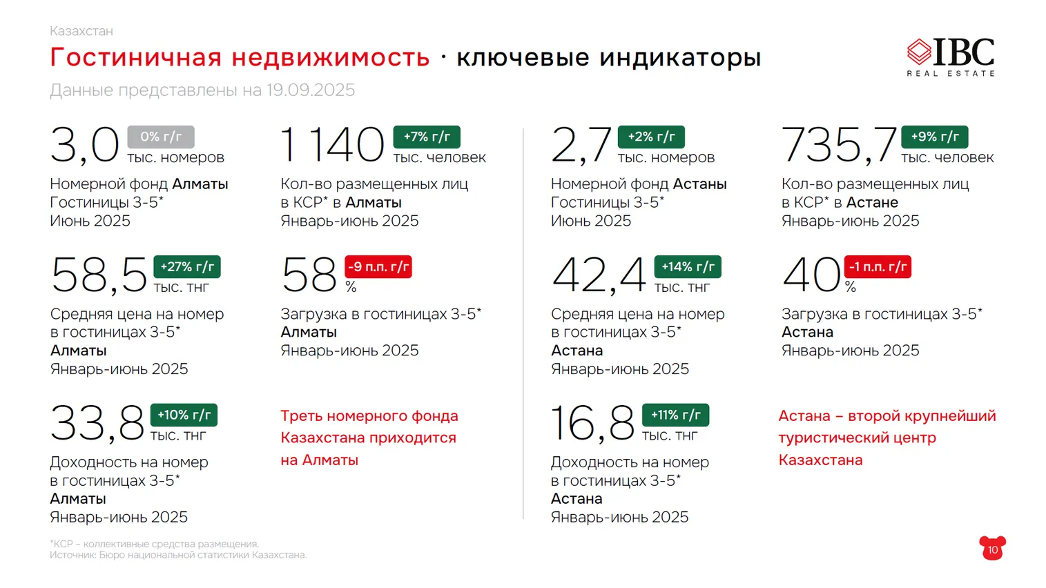 «Доходность на номер (16,8 тыс. тенге) и тарифы (42,4 тыс. тенге) – чуть-чуть пониже, но в целом гостиничный сегмент в Алматы и Астане чувствует себя хорошо», – заключает Алексей Ефимов.