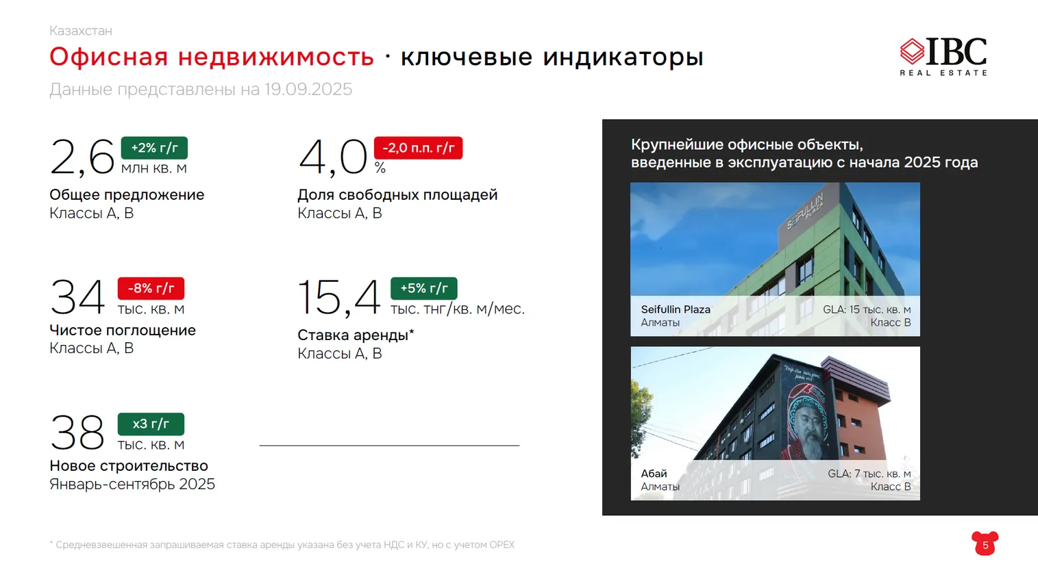 Доля свободных площадей составляет 4%, средняя ставка аренды – 15,4 тыс. тенге за квадратный метр в месяц.