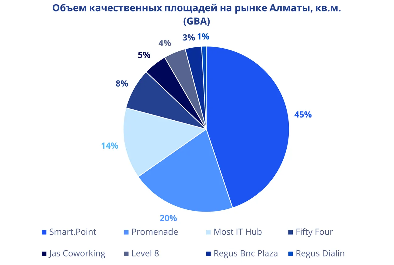 Доля игроков на рынке качественных площадей коворкингов на рынке Алматы выглядит следующим образом: